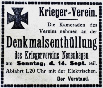 Historische Fotos: Anzeige "Denkmalenthüllung" in der "Strausberger Zeitung" vom 12.09.1924, Archiv Stadtmuseum Strausberg;