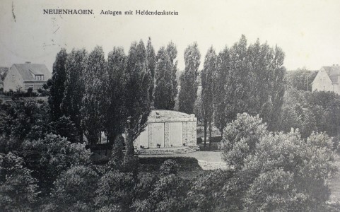 alte AK "NEUENHAGEN. Anlagen mit Heldendenkstein" aus Archiv Dr. Erich Siek; altes Foto "Denkmal mit Pappeln" aus