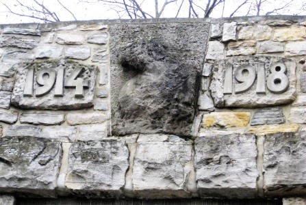 des Kopfes sichtbar. Diese Plastik stammt von dem Bildhauer Georg Morin-Berlin. Links und rechts von dem Schlußstein sind die Jahresdaten des Weltkriegs
