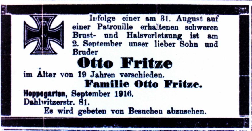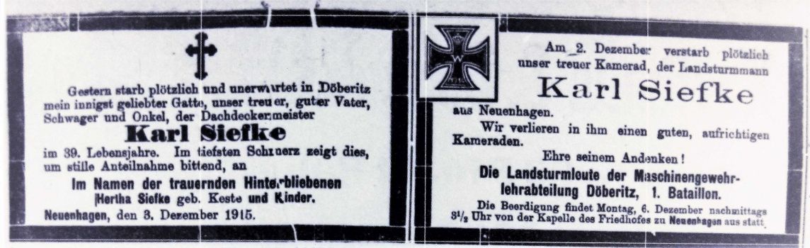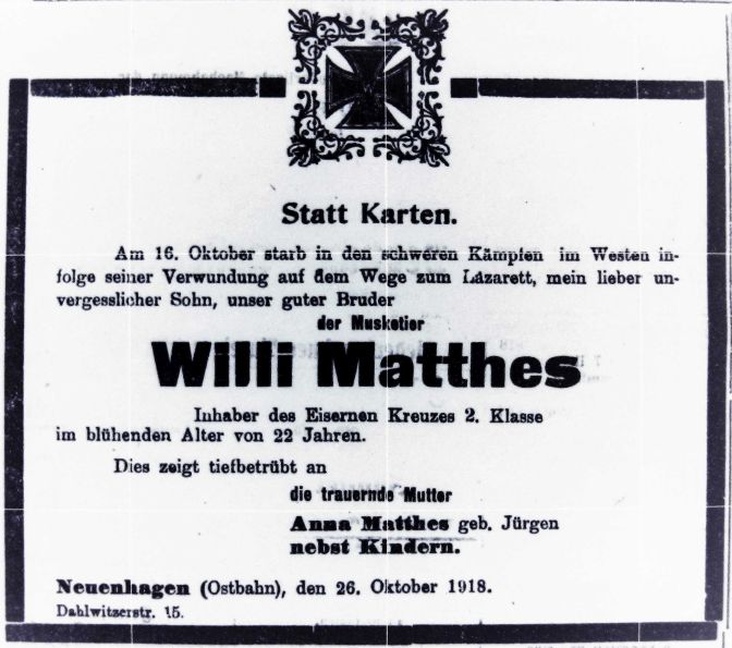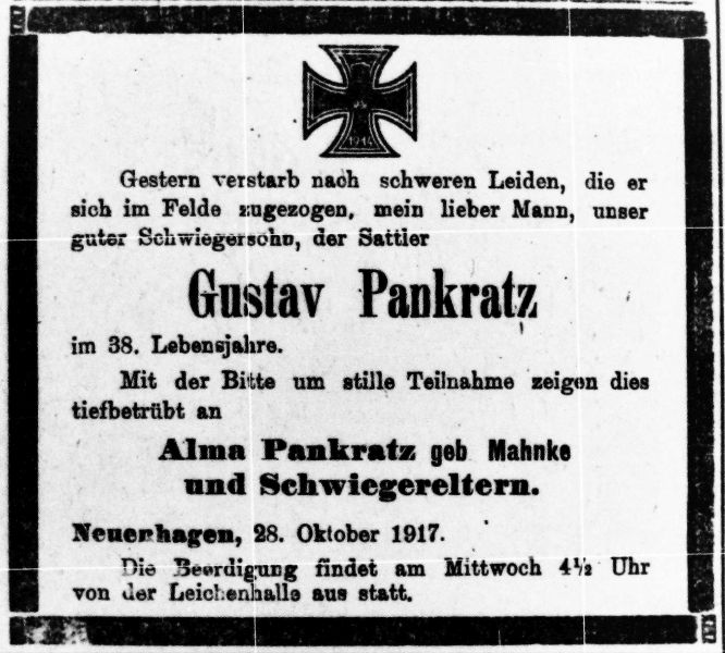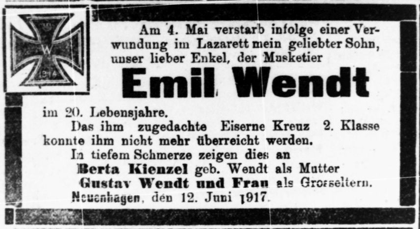 Zu den Abkürzungen bei Quellen: „Kirchenregister“: Ges. KB. 1905-1925. Gestorbene bei der Neuenhagener Kirche „Standesamt“: