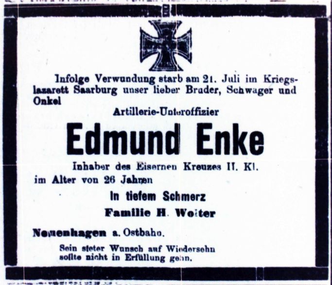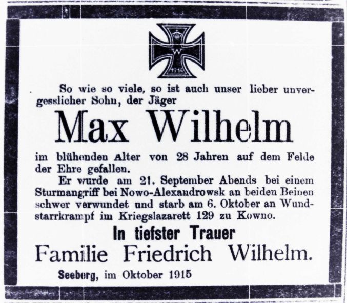 Unteroffizier | TIMME | 35 Jahre | 11.05.1916 | Aus Magdeburg; gestorben an Starrkrampf in Folge einer Verwundung vor Jakobstadt (Schrappnellschuss im Unterschenkel) im Sanatorium Hoppegarten. Beerdigung am 14. Mai in Neuenhagen (Kirchenregister 1916) | ||