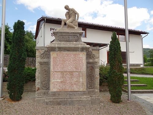 Kriegerdenkmal vor einer Restmauer, an den Seiten Verzierungen,