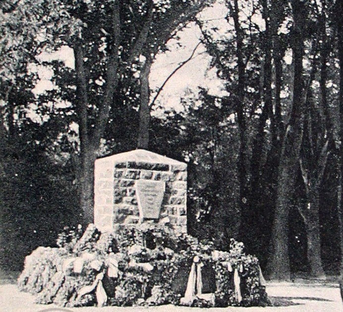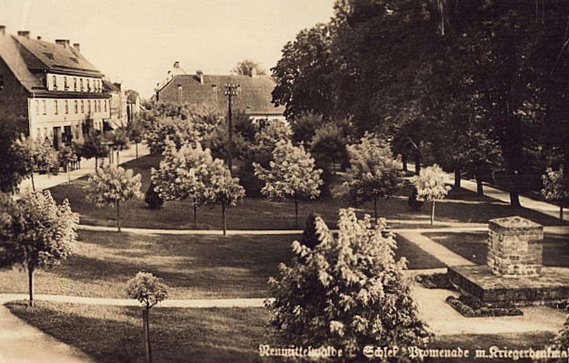 Denkmal für die Gefallenen des 1. Weltkriegs. Breite Stele mit abgesetzter Spitze. Daran eine kleine Widmungstafel (abgerissen). Aufgrund der alten Postkarten konnten keine Inschriften abgelesen werden. Es ist auch unbekannt, ob sich Namen an den anderen Seiten befanden.