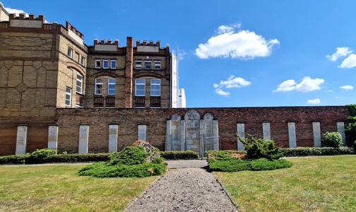 Die Stelen zu beiden Seiten tragen die Namen der Gemeindemitglieder, die früher hier bestattet wurden.