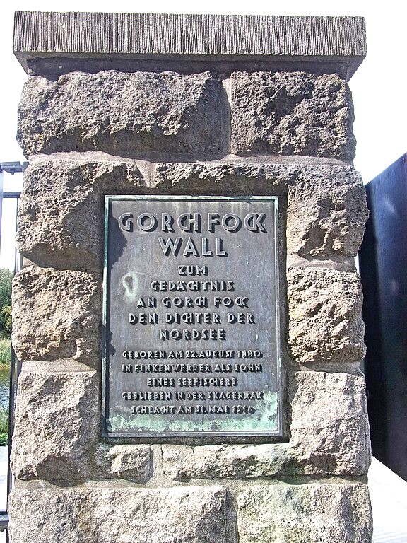 Denkmal für Gorch Fock. Eine Bronzeplatte von 1950 im Rustikpfeiler der Umzäunung von „Planten un Blomen“.