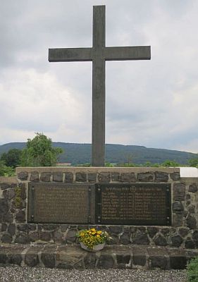 Zwei in die Friedhofsmauer eingebettete Gedenkplatten, darüber ein Kreuz.
