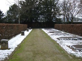 Rasengräberfeld mit liegenden Sammel-Kissensteinen in rotem Sandstein.