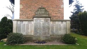 An der Ostseite das Ehrenmal für die Kriegstoten beider Weltkriege aus Berend, Neuberend, Brekling und Nübel mit 53 bzw. 97 Namen.