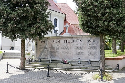 Denkmal für die Gefallenen des Ersten Weltkriegs vor der katholische Kirche in Ober Kunzendorf.
