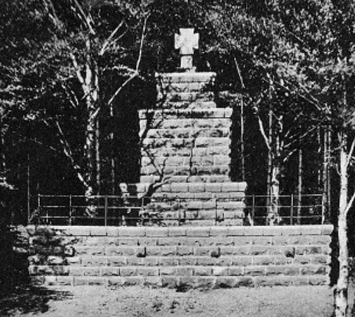 Hinter dem Denkmal stand eine Wand mit drei eingelassenen Tafeln von der heute nur noch Reste des Sockels stehen.