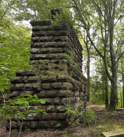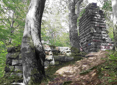 Aus Steinblöcken gemauerte Bastion mit dreistufigem Turm, früher gekrönt von einem EK-Zeichen.