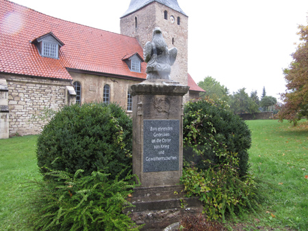 Vor der Dorfkirche steht ein Steindenkmal mit krönendem Adler und polierter Steintafel mit allgemeiner Inschrift.