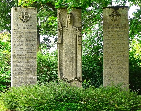 gekommenen Soldaten. In die jeweils obersten Quadersteine ist ein Kreuz auf Eichenlaubblättern sowie die nachstehende Widmung eingearbeitet.