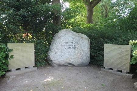 flankiert von zwei Steintafeln mit den Namen der Gefallenen.