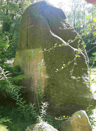Sehr großer aufgerichteter Findling mit Widmung und eingraviertem Kreuz (ohne Namen).
