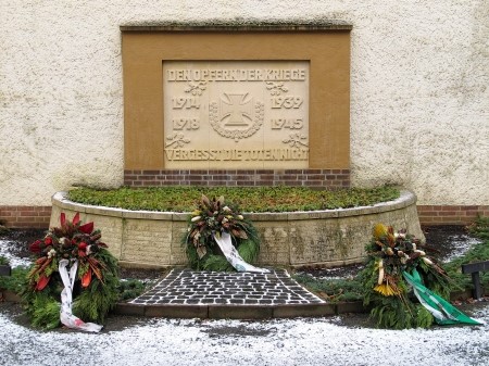 An der Südwand der Friedhofskapelle eingelassene Gedenkplatte für die Kriegstoten beider Weltkriege.