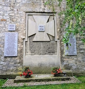Das ursprüngliche Kriegerehrenmal für die im Ersten Weltkrieg Gefallenen des Ortes wurde in die äußere Turmwand der Kirche St. Philippus und St. Jakobus als Flachrelief eingearbeitet. Dabei wurden verschiedene Materialien wie Sandstein, Putz u. a. verarbeitet. Das Denkmal wird dominiert von einem überdimensionierten Eisernen Kreuz. Diesem wurden nach dem Zweiten Weltkrieg die Jahreszahlen des Ersten Weltkrieges auf einer separaten Tafel aufgesetzt. Unter dem Kreuz stehen die Vornamen und Familiennamen der Opfer dieses Krieges. Die Namen der Gefallenen des Zweiten Weltkrieges werden auf Tafeln genannt, die später links und rechts neben dem Relief angebracht wurden. Unterhalb von diesem Denkmal erhebt sich eine schlichte etwas über dem flachen Rasen erhabene Platte für Blumen oder andere Gebinde. Um diese herum ein schmaler Kiesstreifen.