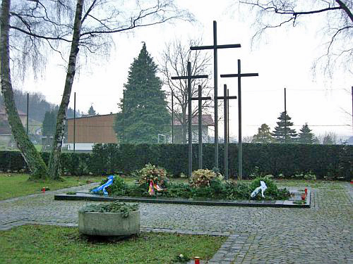 Fünf Kreuze, davor sind Gedenktafeln auf dem Boden aneinander gereiht.