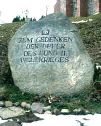 Vor der Kirche an der Straße ein Findling mit Gedenkinschrift.