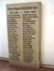 Im Vorraum der Kirche befindet sich rechtseitig eine steinerne Gedenktafel mit Namen der Gefallenen beider Weltkriege.