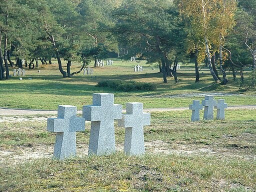 Deutscher Soldatenfriedhof und Gedenkstätte Pillau. Stelen mit tausenden von Namen.