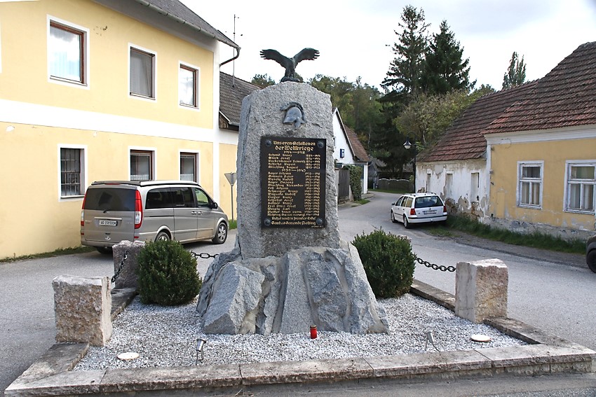 An der Hauptstraße: Denkmal aus Natursteinen, oben mit Adler und Gedenkstafel.