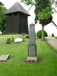 Auf dem Kirchhof von Quars (Kværs) ein schwarzer Obelisk auf Sockel für die 37 Kriegstoten des Ersten Weltkrieges.