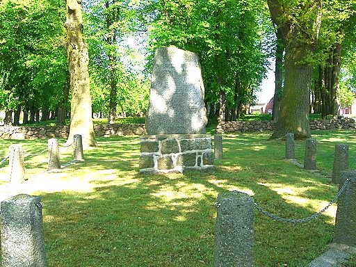 Vor der Kirche an der Dorfstraße: Auf einem Feldsteinsockel ein Monolith mit Namen und Inschrift in weißen Buchstaben, umgeben von kleinen Steinsäulen.
