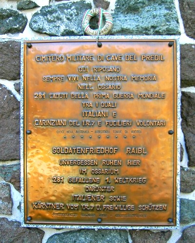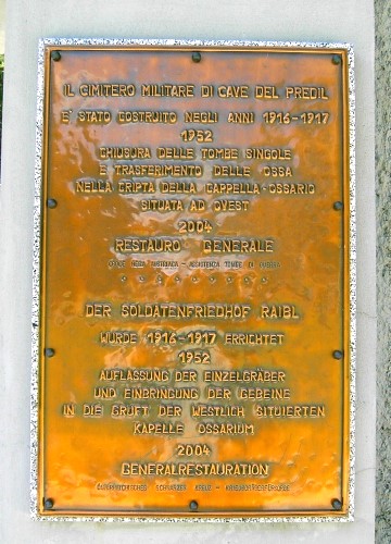 Soldatenfriedhof in Raibl (Cave del Predil) im Seebachtal, Italien: Zwei Namenstafeln in einem Ossario am Pfarrfriedhof.