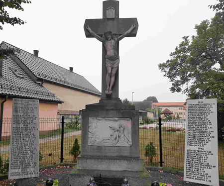 Aufgesetzt ist ein großes Stein-Kruzifix. Nach 1990 wurden seitlich zwei Namenstafeln für die Gefallenen des 2. Weltkriegs beigestellt.