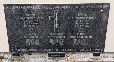 An der äußeren Kirchenwand ist eine Tafel angebracht, die verstorbenen Pfarrer der Gemeinde gewidmet ist.