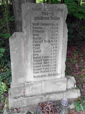 Am Denkmal des 1. Weltkriegs sind die Außenkanten beschädigt, so dass einige Todesorte nicht mehr lesbar sind.