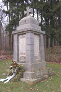 Sandsteinmonument auf zweistufigem Sockel mit Tatzenkreuz „14/18“ auf der Krone. Relief: Stahlhelm auf Eichenlaub.