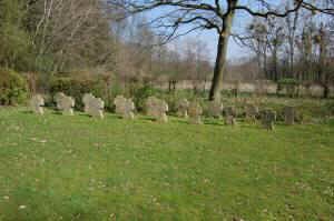 32 Grabkreuze aus Sandstein jeweils zur Hälfte rechts und links neben dem Denkmal mit Namensinschriften für die Gefallenen des Zweiten Weltkrieges.