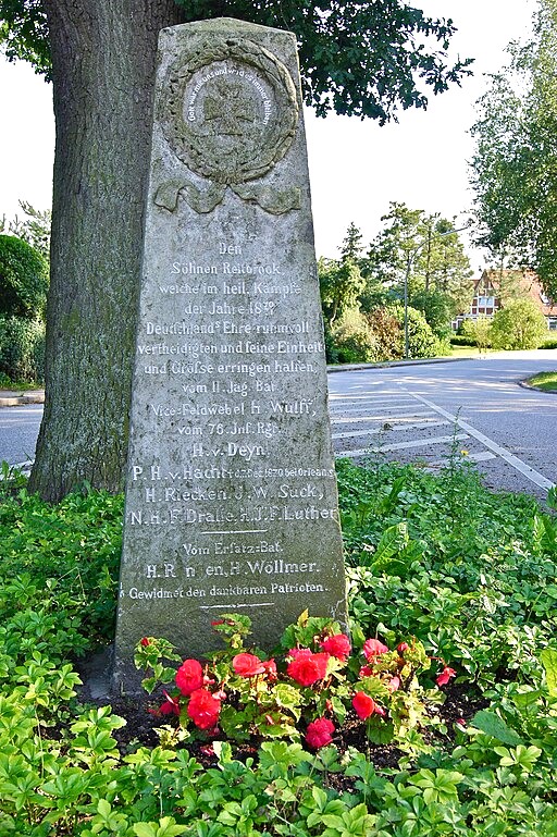 Kleiner Sandsteinobelisk unter einer Eiche in der Mitte einer Straßeneinmündung. Oben in Relief Lorbeerkranz und Eisernes Kreuz.