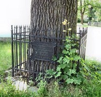 1870/71: Eine Eiche ist von einem schwarzen, eisernen Zaun umgeben, daran eine gusseiserne Tafel mit Inschrift und Namen.