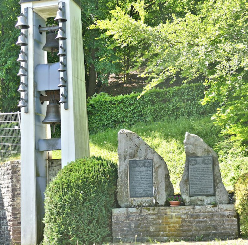 Zwei Steinfindlinge mit Gedenktafeln auf einer kleinen Mauer.