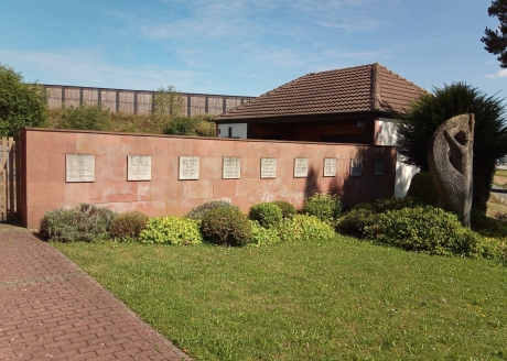 Im Vordergrund eine Figur, dahinter eine mit Sandsteinplatten verkleidete Wand, an der Namenstafeln aus Stein angebracht sind.