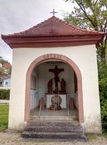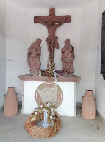 Am Ortseingang befindet sich eine Kapelle mit einer Kreuzigungsgruppe. Links und rechts an den Innenwänden ist eine Namenstafel aus Stein und eine weitere aus Marmor befestigt.