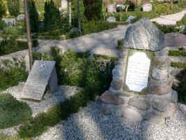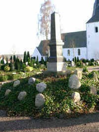 Ein schwarzer Obelisk mit gestuftem Sockel auf einem kleinen Hügel. Um den Hügel sind 25 Findlinge gesetzt mit den Namen der 29 Kriegstoten des Ersten Weltkrieges.