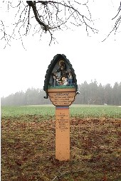 Bildstock etwas außerhalb vom Ort, Richtung Keltengrab, oben Bildnis „Hl. Konrad mit Kinder“, darunter Inschriften.