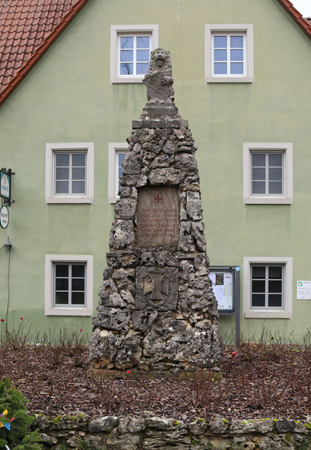 Gemauerte, nach oben sich verjüngende Steinsäule mit dem bayerischen Löwen und Wappen als oberen Abschluss.