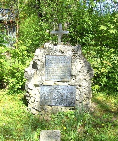 Wanderparkplatz Röthardt: Steinblock mit Kreuz, darunter Metalltafeln mit den Namen beider Weltkriege.