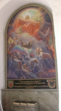 In der Turmhalle der Stadtkirche unter einem allegorischen Gemälde von Rudolf Schäfer das dreibändige Gedenkbuch mit Namen der 585 Opfer des Zweiten Weltkrieges.