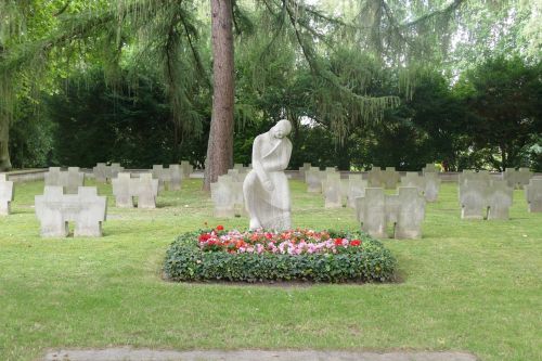 Steinfigur, dahinter sind Kreuze, Doppelkreuze sowie einzelne Gedenktafeln aufgestellt.