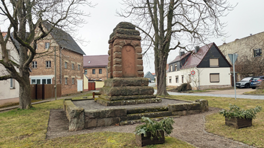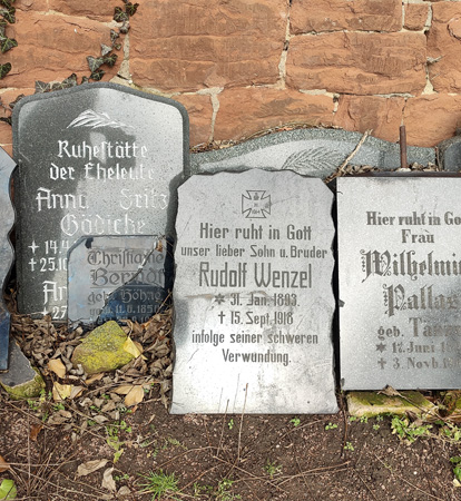 Ein alter, abgeräumter Grabstein mit Einzelgedenken auf dem Kirchhof.