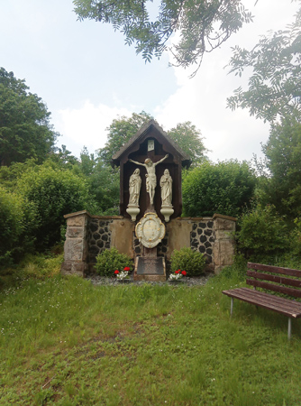 Kreuzigungsgruppe mit Holzüberdachung auf einer u-förmig angelegten Mauer.