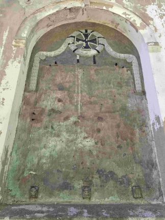 In der freien Fläche darunter erkennt man noch Metallanker an denen vier Widmungs- und Namenstafeln befestigt waren,