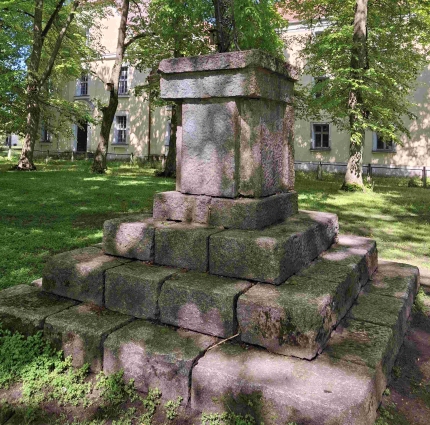 20 Meter entfernt davon steht das Denkmal aus Steinblöcken mit dreistufigem hohem Sockel,
