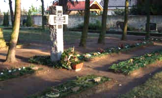 Kriegsgräberstätte auf dem Friedhof. In der Anlage ein großes weißes steinernes Kreuz mit der Inschrift.